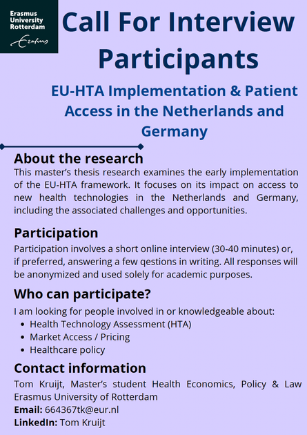 For my thesis, I am conducting research on the early implementation of the EU Health Technology Assessment (EU-HTA) framework and its potential implications for access to new health technologies, with a focus on the Netherlands and Germany.