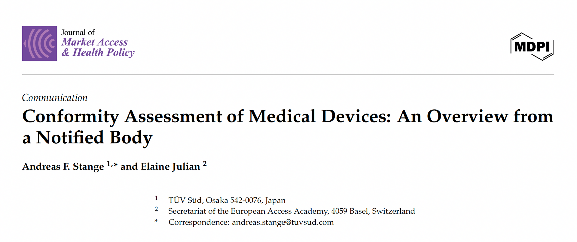 The manuscript by Andreas Stange (TÜV SÜD) and Elaine Julian (EAA Secretariat), which is part of the Topical Collection on EU HTA at the Journal of Market Access and Health Policy, provides an overview of the process, challenges and an outlook for the implementation of the MDR and IVDR regulations.